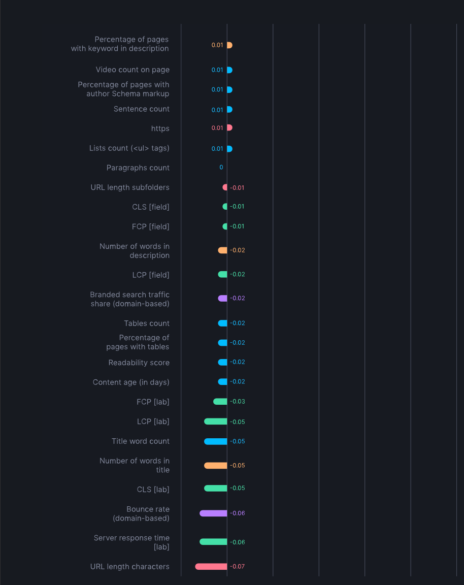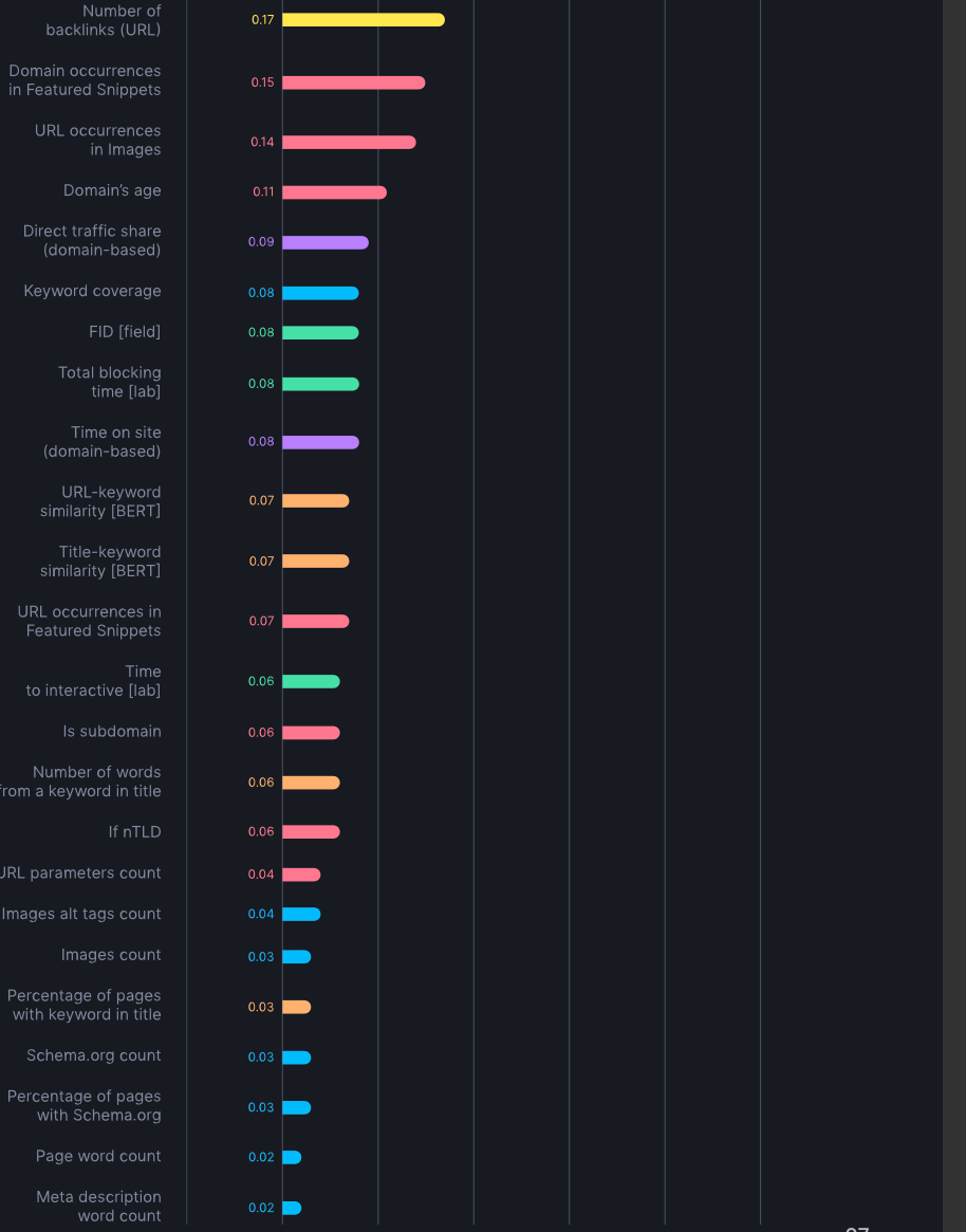- Tekst relevantie: Het gebruik van BERT-model embeddings om de relevantie van de inhoud ten opzichte van de zoekopdracht te beoordelen. Top-ranking pagina’s tonen een hogere relevantie vergeleken met lagere posities.